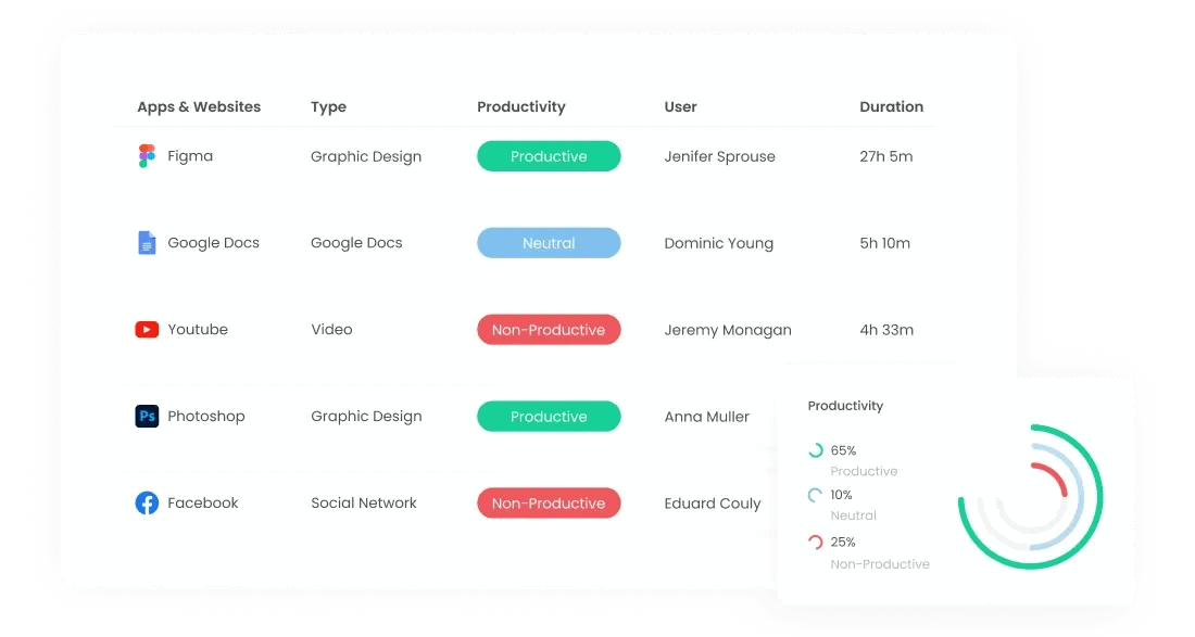 Gain insights into team members' activities, including applications opened, websites visited, and periods of inactivity, ensuring accountability and productivity.